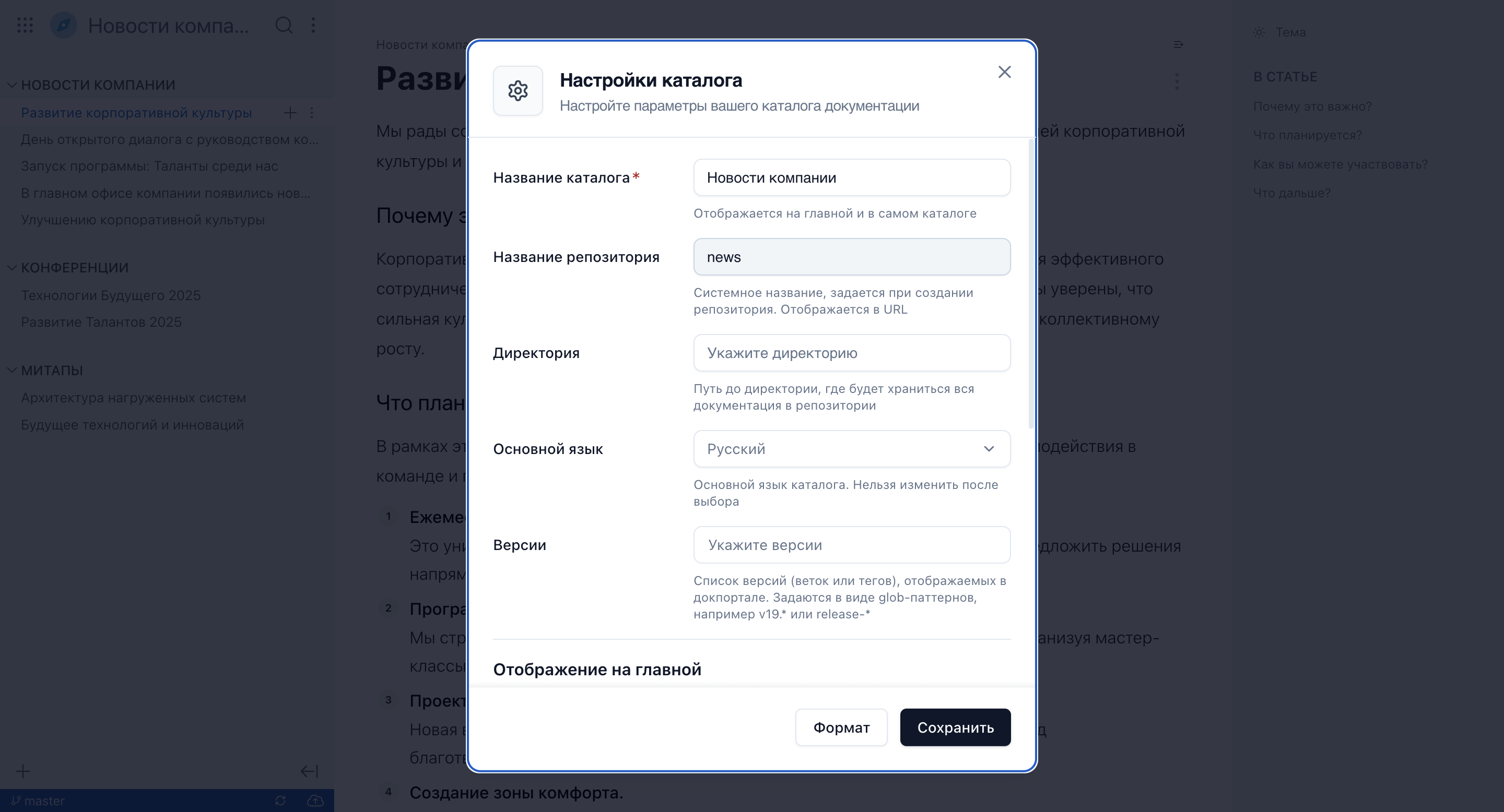 Название репозитория — отображается в cсылках и в Git-хранилище. После публикации нового каталога в хранилище этот параметр изменить нельзя. Если каталог загружен из хранилища — параметр также заблокирован для изменения.